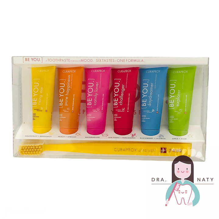 El Pack Curaprox Be You incluye 6 pastas dentales de 10ml y un cepillo Curaprox 5460 ultra suave, diseñado especialmente para el cuidado óptimo de tus dientes y encías. Este práctico set es perfecto para llevar contigo a todas partes o como un regalo único. Podrás elegir el color de tu cepillo, adaptándolo a tu estilo personal.
